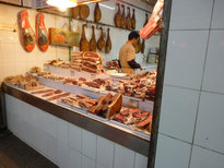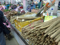 肉、野菜、果物など食材が豊富に並ぶ。魚は全部川魚だ。なぜだろう?