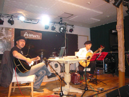 写真:ベンさんとピロミさんのライブ・ハウス「アヴァンティー」にて、ちょっと真剣に演奏中。左の方が石田氏。