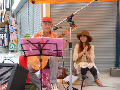 23日(土) 花園商店街の月に一度の市、「花園マルシェ」にて、歌声テントなるものを開催す。これで3回目である。最初は大雨の中を、次は猛暑の下で…。今回やっとまともな状態で演奏できる。若き女性二人が助っ人で協力してくれる。うれしいかぎりである。彼女たちの手作りの商品も結構売れていた。