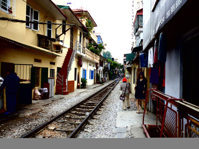 単線、幅約3メートル。両サイドには民家の玄関が…。廃線に非ず。